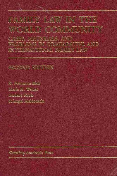 Book annotation not available for this title. Title: Family Law in the World Community Author: Blair, D. Marianne/ Weiner, Merle H./ Stark, Barbara/ Maldonado, Solangel Publisher: Carolina Academic Pr Publication Date: 2009/08/31 Number of Pages: 911 Binding Type: HARDCOVER Library of Congress: 2009499552 Additional Details \N BOOK TYPE : NF BRAND : Blair, D. Marianne/ Weiner, Merle H./ Stark, Barbara/ Maldonado, Solangel DEWEY CLASSIFICATION : 346 LANGUAGE : ENGLISH NUMBER OF PAGES : 911 PUBLISHER IMPRINT CODE : CARAP PUBLISHER NAME : CAROLINA ACADEMIC PR RETURNS ACCEPTED? : YES