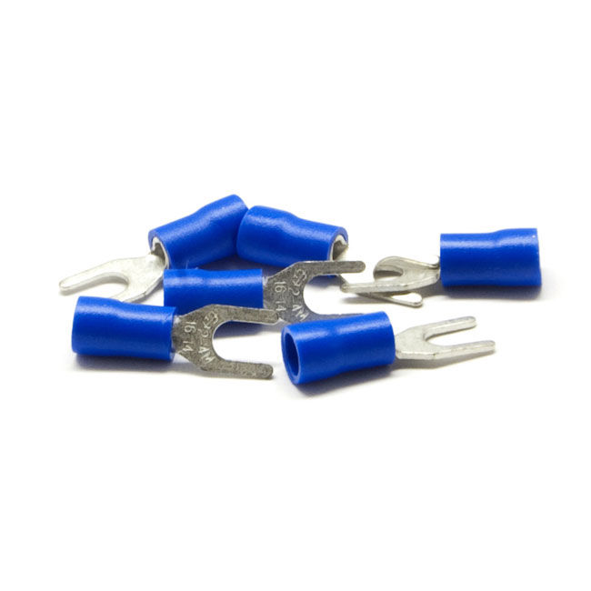 These blue fork terminals are designed connect a screw or stud to wires of the following gauges(AWG): 14 and 16. They supply a tidy and professional finished product. One uses this quick disconnect terminal by inserting the bare wire end into the terminals flared end and then crimping. Additional Details Wire: 16 to 14AWG Weight: 0.21 lbs BRAND : CABLE WHOLESALE COLOR : BLUE COLOR : BLUE COLOR : BLUE COLOR : BLUE COLOR : BLUE COLOR : BLUE COLOR : BLUE COLOR : BLUE COLOR : BLUE COLOR : BLUE COLOR : BLUE COLOR : BLUE SKU : 55TR-20012