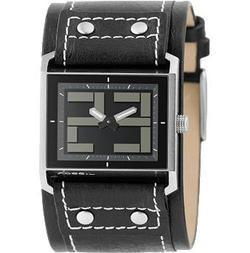 Black metallic dial Stainless steel case Black genuine leather strap Buckle clasp 39mm 2-hand ana-digi movement Water resistant up to 5 ATM 11-year limited warranty Imported