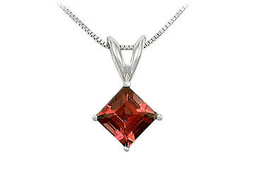 A square natural garnet is securely held in a luscious 14K white gold prong setting. This gemstone pendant has a total weight (TGW) of 1.00 and comes with a standard 16 14K white gold chain. Available in yellow gold also.