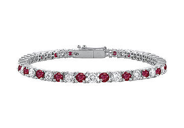 Get caught in the rapture of GF bangkok rubies and white CZs. Radiant round created rubies alternate with white CZs in a 10K white gold prong-setting. With gems consistent all around it symbolizes your eternal love. This tennis bracelet has a total gem weight (TGW) of 3.00 carats.