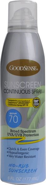Good Sense Continuous Spray Spf 70 6 oz. Compare to Coppertone Ultraguard Continuous Sp. Avobenzone 3%, Homosalate 15%, Octisalate 5%, Octocryllene 10%, Oxybenzone 6%. This wholesale bulk cheap discount sunscreen spray is proudly made in the USA." Case Pack 12 Please note: If there is a color/size/type option, the option closest to the image will be shipped (Or you may receive a random color/size/type). BRAND : GOOD SENSE
