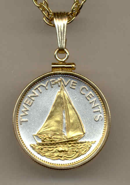 Each one of these new un-circulated condition real 25 cent ( U.S. quarter size) coins from the Bahamas is first layered in pure Bright Silver. Then the figures of each are highlighted and brought to life with rich pure 24K Gold (this gold work is done by hand). This breathtaking and exclusive work turns these coin into stunning and true works of art. Each coin is hermetically sealed against wear in clear, hard acrylic coating. . Each coin comes with Gold filled Plain edge bezel, on a good quality 14K gold layered 18 rope chain and placed in a nice jewelry box Warranty 90 days BRAND : J&J Coin Jewelry