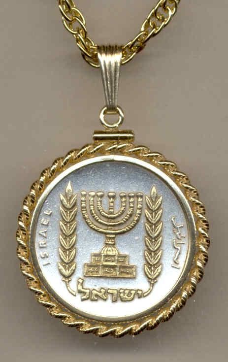 Each one of these real ½ Lirah (U.S. quarter size) coins from Israel ( in Extremely fine condition) is first layered in pure Bright Silver. Then the figures of each are highlighted and brought to life with rich pure 24K Gold (this gold work is done by hand). This breathtaking and exclusive work turns these coin into stunning and true works of art. Each coin is hermetically sealed against wear in clear, hard acrylic coating. Each coin comes with Gold filled Rope edge bezel, on a good quality 14K gold layered 18 or 24 in. rope chain and placed in a nice jewelry box Warranty 90 days BRAND : J&J Coin Jewelry
