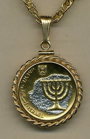 Each one of these real 10 Agorot (U.S. nickel size) coins from Israel (in Uncirculated condition) is first layered in pure Bright Silver. Then the figures of each are highlighted and brought to life with rich pure 24K Gold (this gold work is done by hand). This breathtaking and exclusive work turns these coin into stunning and true works of art. Each coin is hermetically sealed against wear in clear, hard acrylic coating. Each coin comes with Gold filled Rope edge bezel, on a good quality 14K gold layered 18 or 24 in. rope chain and placed in a nice jewelry box Warranty 90 days BRAND : J&J Coin Jewelry
