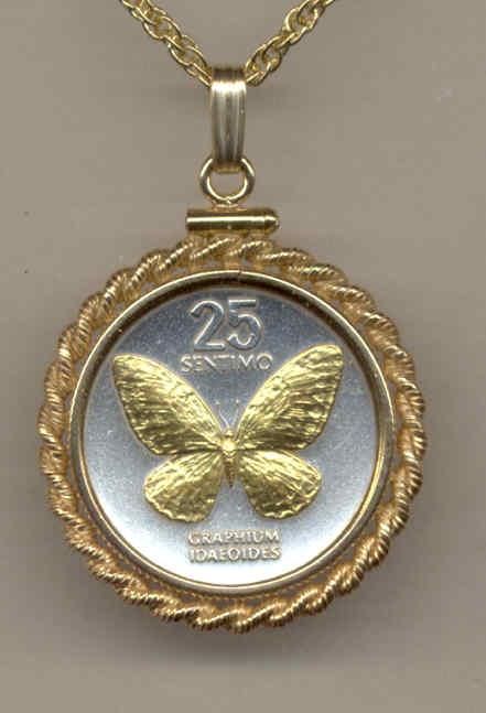 Each one of these real 25 sentimos (U.S. nickel size) coins from the Philippines (in Uncirculated condition) is first layered in pure Bright Silver. Then the figures of each are highlighted and brought to life with rich pure 24K Gold (this gold work is done by hand). This breathtaking and exclusive work turns these coin into stunning and true works of art. Each coin is hermetically sealed against wear in clear, hard acrylic coating. Each coin comes with Gold filled Rope edge bezel, on a good quality 14K gold layered in. rope chain and placed in a nice jewelry box Warranty 90 days BRAND : J&J Coin Jewelry