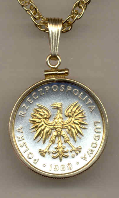 Each one of these almost new un-circulated condition real 5 zlotych (U.S. quarter size) coins from Poland is first layered in pure Bright Silver. Then the figures of each are highlighted and brought to life with rich pure 24K Gold (this gold work is done by hand). This breathtaking and exclusive work turns these coin into stunning and true works of art. Each coin is hermetically sealed against wear in clear, hard acrylic coating. Each coin comes with Gold filled Plain edge bezel, on a good quality 14K gold layered 18 rope chain and placed in a nice jewelry box BRAND : J&J Coin Jewelry