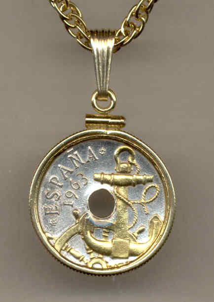 Each one of these almost new un-circulated condition real 50 centimes (U.S. nickel size) coins from Spain is first layered in pure Bright Silver. Then the figures of each are highlighted and brought to life with rich pure 24K Gold (this gold work is done by hand). This breathtaking and exclusive work turns these coin into stunning and true works of art. Each coin is hermetically sealed against wear in clear, hard acrylic coating. Each coin comes with Gold filled Plain edge bezel, on a good quality 14K gold layered 18 rope chain and placed in a nice jewelry box BRAND : J&J Coin Jewelry