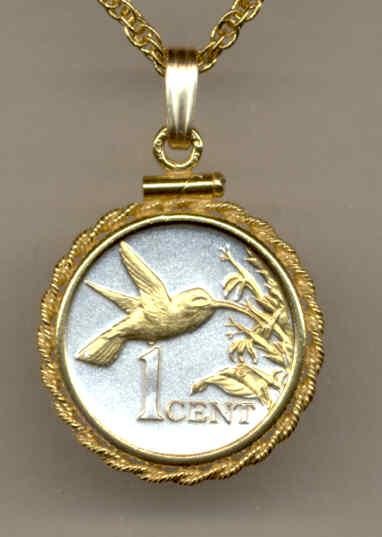 Each one of these real 1 cent (U.S. dime size) coins from Trinidad & Tobago (in Uncirculated condition) is first layered in pure Bright Silver. Then the figures of each are highlighted and brought to life with rich pure 24K Gold (this gold work is done by hand). This breathtaking and exclusive work turns these coin into stunning and true works of art. Each coin is hermetically sealed against wear in clear, hard acrylic coating. Each coin comes with Gold filled Rope edge bezel, on a good quality 14K gold layered 18 in. rope chain and placed in a nice jewelry box Warranty 90 days BRAND : J&J Coin Jewelry
