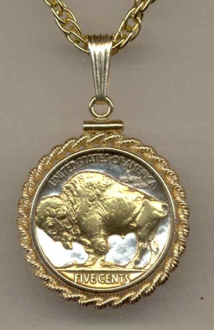 Each one of these old U.S. Buffalo nickel coins ( in Extremely fine condition) is first layered in pure Bright Silver. Then the figures of each are highlighted and brought to life with rich pure 24K Gold (this gold work is done by hand). This breathtaking and exclusive work turns these coins into stunning and true works of art. Each coin is hermetically sealed against wear in clear, hard acrylic coating. . Each coin comes mounted in a gold filled rope type bezel (frame), on a good quality 14k gold layered 18 in. rope chain and placed in a nice jewelry box. Warranty 90 days BRAND : J&J Coin Jewelry