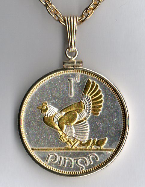 Each one of these new, un-circulated condition real penny (U.S. half dollar size) coins from Ireland is first layered in pure Bright Silver. Then the figures of each are highlighted and brought to life with rich pure 24K Gold & Pure Silver (this gold & Silver work is done by hand). This breathtaking and exclusive work turns these coin into stunning and true works of art. Each coin is hermetically sealed against wear in clear, hard acrylic coating. . Each coin comes with Gold filled Plain edge bezel, on a good quality 14K gold layered 24 in. rope chain and placed in a nice jewelry box Warranty 90 days BRAND : J&J Coin Jewelry