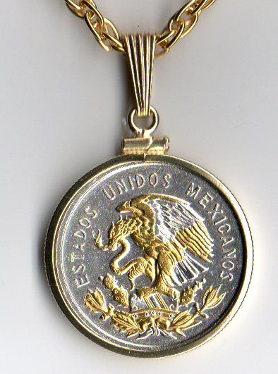 Each one of these new un-circulated real 10 centavo (U.S. quarter size) coins from Mexico is first layered in pure Bright Silver. Then the figures of each are highlighted and brought to life with rich pure 24K Gold & Pure Silver (this gold & Silver work is done by hand). This breathtaking and exclusive work turns these coin into stunning and true works of art. Each coin is hermetically sealed against wear in clear, hard acrylic coating. . Each coin comes with Gold filled Plain edge bezel, on a good quality 14K gold layered 18 in. rope chain and placed in a nice jewelry box Warranty 90 days BRAND : J&J Coin Jewelry