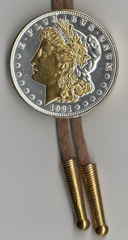 Each one of these old extremely fine condition real 1921 U.S Morgan Silver dollars (minted 1878 - 1921) Has the figures of each highlighted and brought to life with rich pure 24K Gold & Pure Silver (this gold & Silver work is done by hand). This breathtaking and exclusive work turns these coin into stunning and true works of art. Each coin is hermetically sealed against wear in clear, hard acrylic coating. Each coin comes on a nice (soft) bolo cord in a regular bolo box. Warranty 90 days BRAND : J&J Coin Jewelry