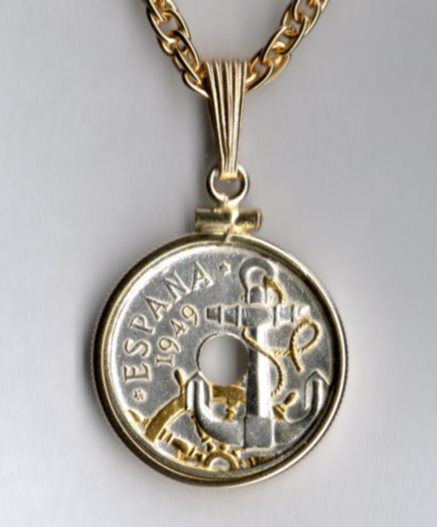 Each one of these extremely fine condition real 50 centimes (U.S. nickel size) coins from Spain is first layered in pure Bright Silver. Then the figures of each are highlighted and brought to life with rich pure 24K Gold & Pure Silver (this gold & Silver work is done by hand). This breathtaking and exclusive work turns these coin into stunning and true works of art. Each coin is hermetically sealed against wear in clear, hard acrylic coating. Each coin comes with Gold filled Plain edge bezel, on a good quality 14K gold layered 18 in. rope chain and placed in a nice jewelry box Warranty 90 days BRAND : J&J Coin Jewelry