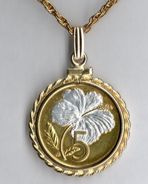 Each one of these new un-circulated condition real 5 cent (U.S. nickel size) coins from the Cook islands is first layered in pure 24k gold. Then the flowers of each are highlighted and brought to life with rich pure silver and 24k gold (this Silver & gold work is done by hand). This breathtaking and exclusive work turns these coin into stunning and true works of art. Each coin is hermetically sealed against wear in clear, hard acrylic coating. . Each coin comes mounted in a gold filled rope type bezel (frame), on an 18 in. rope chain and placed in a nice jewelry box Warranty 90 days BRAND : J&J Coin Jewelry