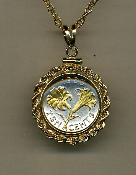 Bermuda (U.S. dime size) 10 cent coin. All coins are in new uncirculated condition. Each coin is first layered in pure silver. Then the figures of each (Lily) are highlighted and brought to life with rich pure 24K Gold (this gold work is done by hand). This breathtaking and exclusive work turns these coin into stunning and true works of art. Each coin is also hermetically sealed against wear in clear, hard acrylic coating then mounted in Special gold filled Real Rope bezel with matching 14K gold filled 18 rope chain. Beautifully boxed Warranty 90 days BRAND : J&J Coin Jewelry