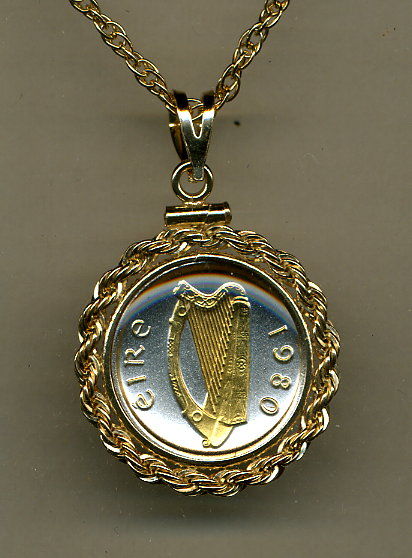Irish (U.S. dime size) ½ penny coin. All coins are in new uncirculated condition. Each coin is first layered in pure silver. Then the figures of each (Harp) are highlighted and brought to life with rich pure 24K Gold (this gold work is done by hand). This breathtaking and exclusive work turns these coin into stunning and true works of art. Each coin is also hermetically sealed against wear in clear, hard acrylic coating then mounted in Special gold filled Real Rope bezel with matching 14K gold filled 18 rope chain. Beautifully boxed Warranty 90 days BRAND : J&J Coin Jewelry