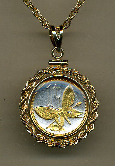 Papa New Guinea (U.S. dime size) 1 toea coin. All coins are in new uncirculated condition. Each coin is first layered in pure silver. Then the figures of each coin (Butterfly - leaf & bud) are highlighted and brought to life with rich pure 24K Gold (this gold work is done by hand). This breathtaking and exclusive work turns these coin into stunning and true works of art. Each coin is also hermetically sealed against wear in clear, hard acrylic coating. Then mounted in a Special gold filled Real Rope bezel with matching 14K gold filled 18 rope chain. Each one comes beautifully boxed Warranty 90 days BRAND : J&J Coin Jewelry