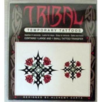 Temporary tattoos are easy to apply and remove. Upc'd for quick resale. Goth tribal rose and cross tattoo. Case Pack 24