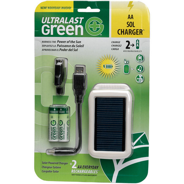 ULTRALAST GREEN SOLAR CHRGR W 2GREEN AA CHRGR W 2 GREEN AA Use the power of the sun for the ultimate in Green power AA batteries charge in 820 hoursCharges USB power pack for cell phones, Bluetooth headsets and MP3 playersIncludes 2 AA precharged batteries BRAND : ULTRALAST