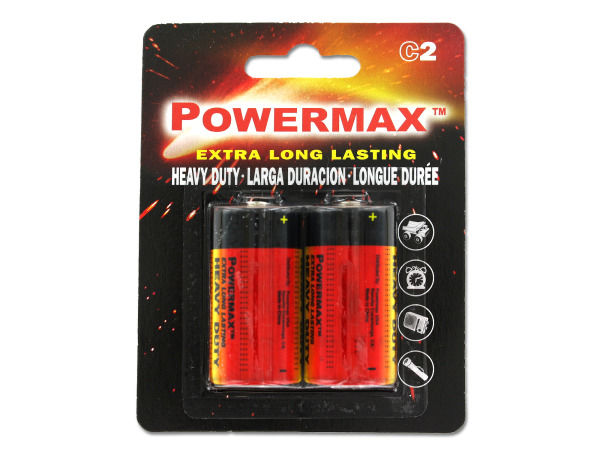 These heavy duty batteries are "C" size and ideal to have on hand in case of emergencies. Use in flashlights, radios, toys and more. Each pack comes with 2 batteries. Set is packaged on a blister card with hanging hole. Keep away from children. Case of 36 BRAND : BULK BUYS COLORS : BLACK,YELLOW,RED MATERIALS : METAL
