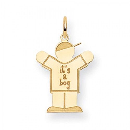 This Is an Amazing It'S a Boy Charm Made of 14k Yellow Gold. It Has a Boy in Shirt with "It'S a Boy" Symbol. This Charm Is Finished to a Mirror Like Polish Metal. Purchase This Enticing It'S a Boy Charm Now and Have a Beautiful Piece of Accent. Processing Time: 1 days. BRAND : GEMAFFAIR CHAIN TYPE : NO CHAIN TYPE CLASP TYPE : NO CLASP TYPE HEIGHT : 1 LENGTH : 23 METAL STAMP : 0.8 METAL TYPE : YELLOW GOLD METAL UNIT OF MEASURE : GRAMS TOTAL METAL WEIGHT : 14K UNIT OF MEASURE (DIMENSIONS) : MM WIDTH : 14