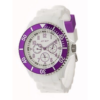 Jet Set is the Celebrities Watch of choice. Jet Set comes from the lifestyle of travelling from one upscale and exotic place to another via jet airplanes. The lifestyle of beauties in bikinis; fast cars; passion; glamour and royal treatment. The Jet Set man and woman love publicity and are entertained in nightclubs in Marbella; St Tropez and Monaco. Always followed by the paparazzi. Wanted by everyone.One day you're in Paris and the next week you fly to Rome only to attend a party. The lifestyle provides you a satisfying and glamorous style representing luxury which season after season combines innovation with the latest trends. The Jet Setters know how to get the most out of life.Band Color: White Rubber; Band Width: 21mm near case; 21mm near clasp/buckle; Bezel Color: Purple; Case: White + Circle-shaped; Case Finish: Polished + Stainless Steel; Case Thickness: 14mm; Case Width: 44mm; 48mm with crown; Clasp / Buckle: Strap Buckle; Dial: White + analog; Hand Color: Multicolor; Movement: Japanese + quartz; Time Zones: Single With 24 Hour Dial; Water Resistance: 10 atm; Other Features: Day and Date Display BRAND : JET SET OF SWEDEN