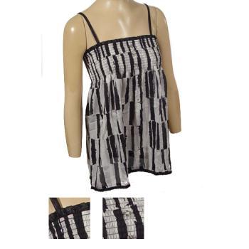Ladies Silky Top With 3 Plastic "Diamond" Buttons and Adjustable Spaghetti Straps Made in China Sizes: S. M. L. Fabric: 100% Polyester Color:Black/White. Case Pack 6