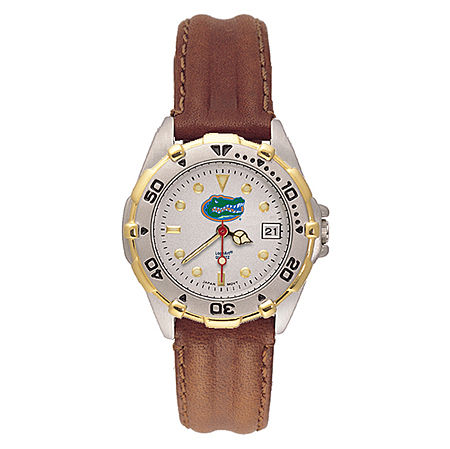 Keep Track of Time in Style with This Ladies University of Florida All Star Watch. This Gators Watch Comes with a Outstanding Two Tone Brushed Chrome Finish and Rotating Bezel. the Dial Is Decorated with the Gators Official Logo and Comes with a Date Window. the Leather Strap Turns This Simple Timekeeping Device Into a Classy Accessory. Become the Ultimate University of Florida Fan with This Ladies University of Florida All Star Watch. BRAND : NCAA OFFICIALLY LICENSED CHAIN TYPE : NO CHAIN TYPE CLASP TYPE : BUCKLES HEIGHT : 5 LENGTH : 31 METAL STAMP : 30 METAL TYPE : BRASS METAL UNIT OF MEASURE : GRAMS TOTAL METAL WEIGHT : NO METAL STAMP UNIT OF MEASURE (DIMENSIONS) : MM WIDTH : 31