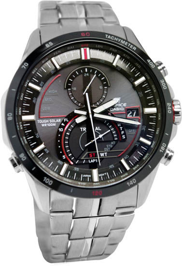 Short Description: Edifice Tough Solar Chronograph Stainless Steel Case and Bracelet Black Tone Dial Additional Details Casio Edifice Tough Solar Chronograph Stainless Steel Case and Bracelet Black Tone Dial Men Casio Edifice Series. Beautiful black tone dial. Chronograph alarm and date features. Stainless steel case and bracelet. Case measures 44mm diaWarranty 30 Days plus Manufacturer BRAND : CASIO