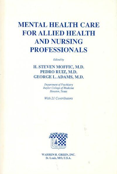 Book annotation not available for this title. Title: Mental Health Care for Allied Health and Nursing Professionals Author: Moffic, H. Steven Publisher: Warren H Green Publication Date: 1989/10/01 Number of Pages: Binding Type: PAPERBACK Library of Congress: 89209480 Additional Details \N BOOK TYPE : NF BRAND : Moffic, H. Steven CD LANGUAGE : ENG DEWEY CLASSIFICATION : 616.89 RETURNS ACCEPTED? : YES