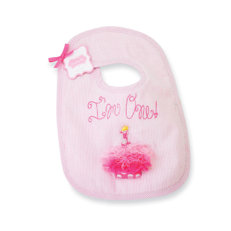 A girls first birthday is a very special time and certainly calls for a celebration. Keep that special birthday outfit clean with an adorable first birthday pink seersucker bib. Baby bib features a pink polka dot cupcake applique topped with pink chiffon as icing ad a pink ribbon candle. Embroidered on the bib is the phrase "I'm One!" Your one-year old will love wearing this bib on her very special birthday. BRAND : MUDPIE