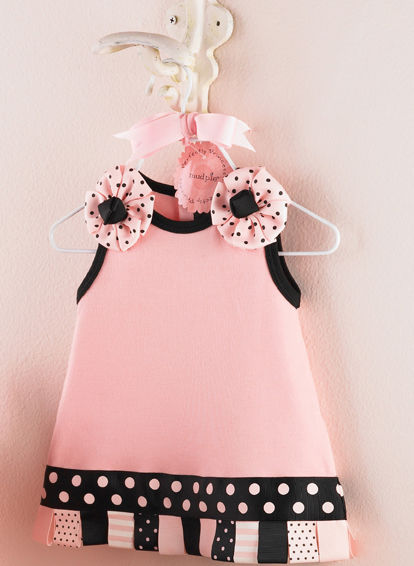 Interlock dress is embellished with ribbon tab hem and ribbon flower detail.