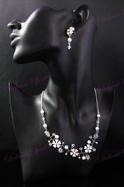 Bridal Wedding Necklace Earring Set Crystal Silver Cherry Blossom Floral Design BRAND : IRISD BRIDAL