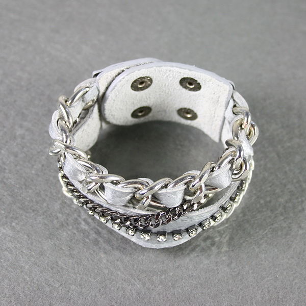 New Silver Leather Rhinestone Cuff Bracelet Wristband Condition: 100% brand new, high quality Material: leather + stainless steel + rhinestone Color: silver Gender: unisex Style: cuff Total length: 22.3cm Weight: 0.059kg Features: u Brand new silver leather wristband with glittering twenty-one rhinestones, beautiful and elegant, made with cow leather and stainless steel, fashionable and eye-catching. u Two rows adjustable stainless steel snap button closure, simple and convenient to wear. u Unique and special design, it is the best choice for these people going along with the trend. Additional Details Item location:China ITEM LOCATION : CHINA