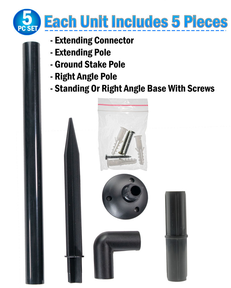 • • DELUXE MULTI USE ACCESSORY SET - Set includes multiple pieces for different applications. Includes a stake for placing tiki torches easily in the yard or garden. Include a stand so you can easily place this on smooth surface or screw into the ground. Includes a u-right angle pole for placement on walls, fences, or posts.