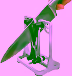 Triple-action knife sharpener (sharpening tool) uses carbide and tungsten abrasives to sharpen, hone, and polish blades.