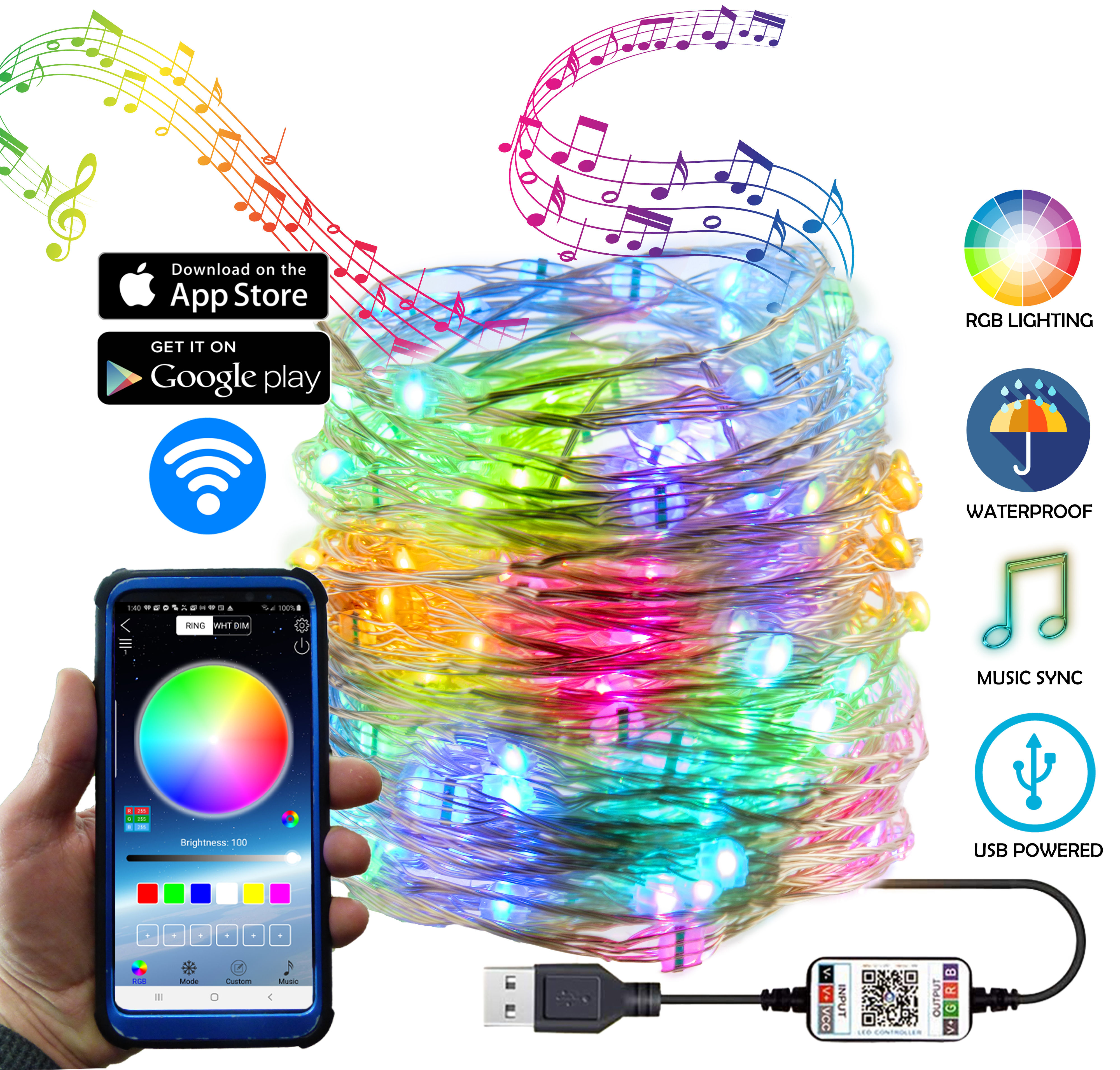 The RGB LED String Light is either 16 feet (50 LEDs), 33 feet (100 LEDs), or 65 feet (200 LEDs) in length depending on the option you choose to purchase. The copper wire is fused with micro LEDs that are placed 4 inches apart from each other. These micro LEDs create a stunning light show effect without the need of a RGB Controller. Each micro LED has been specifically programmed to perform various light effects consisting of fading, color jumping and flashing. Once the LED String lights are turned ON, you can control everything from the IOS or Android application with is free.