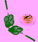 The pan has four unique decorative designs that produce patterned pancakes.
