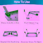 Press in and hold the pin on each leg, then push or pull down to open the legs. Repeat for all four legs. The pin‑lock mechanism keeps the legs in place.