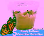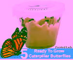 The kit comes with an instruction guide, a voucher for 5 live painted lady caterpillars and food, and a plastic cup. Use the voucher to order the caterpillars. The guide explains how to set up the habitat.