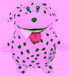 It features a Dalmatian shape with a rounded form, bulbous shape, and protruding tongue.