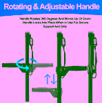 The spring‑loaded handle automatically retracts when not in use, but when you need support it extends to provide a stable grip. The handle can be rotated 360 degrees and adjusted up or down, then locked in place for a secure handhold while you stand.