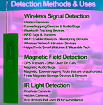 This device offers RF, magnetic, and IR modes, while many RF scanners only detect RF signals. The multi‑mode capability allows it to find hidden cameras, GPS trackers, and wireless bugs. For instance, a single‑mode RF scanner would miss a magnetic GPS tracker.