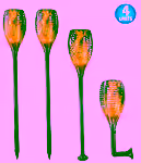 Solar LED tiki torches. Set includes 4 units with 96 LEDs each, providing realistic flickering flame simulation; each torch is waterproof and automatically turns on at dusk, staying lit until dawn. They can line pathways or patios for safe evening illumination, each torch including a ground stake and a wall clip for versatile mounting.