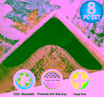 The set contains eight pieces, so you can secure up to eight corners. This allows you to cover all four corners of a rug and the corners of two additional rugs if needed.