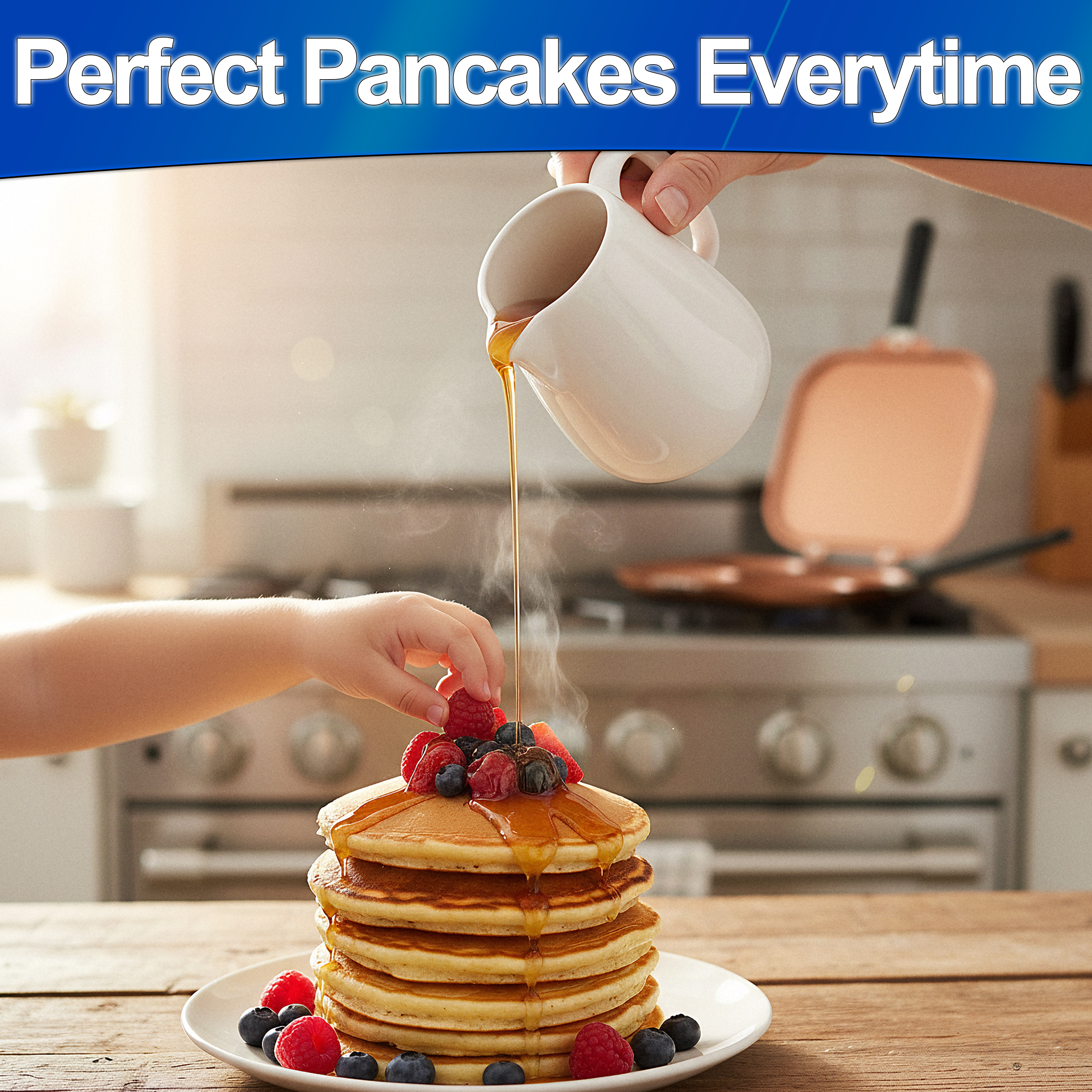 Cook four pancakes at once and flip the whole pan to finish them evenly — a simple trick that halves active flipping and helps breakfast move faster. The flat side doubles as a small 9×9" griddle for sandwiches, eggs or searing. Reinforced rivets and a 6" heat-resistant handle make flipping stable, while the copper-colored nonstick surface reduces sticking so you can use less oil and get cleaner stacks. For long life, use medium heat, soft utensils and hand wash when possible.