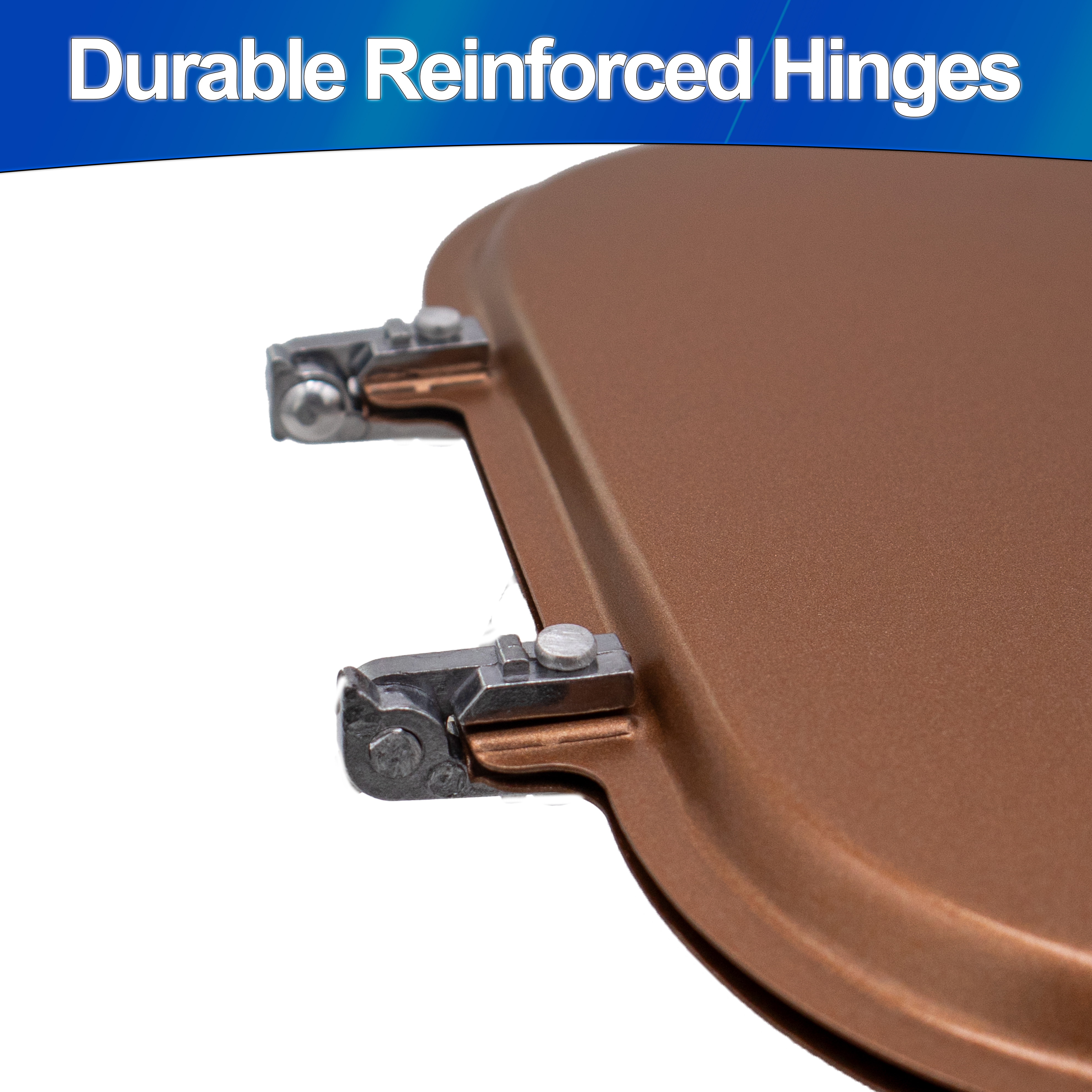 Measured details matter: four 4 3/8" moulds produce uniform pancakes about the size of a small plate, each about 3/8" deep, and the pan’s overall cooking footprint is roughly 9–9.8" square. The body uses a lightweight aluminum form with a copper-colored nonstick finish for even heat and easy release, while riveted steel hinges and a reinforced clamshell hinge reduce misalignment when flipping. These visible design cues add confidence — and they explain why the pan performs like a purpose-built pancake tool.