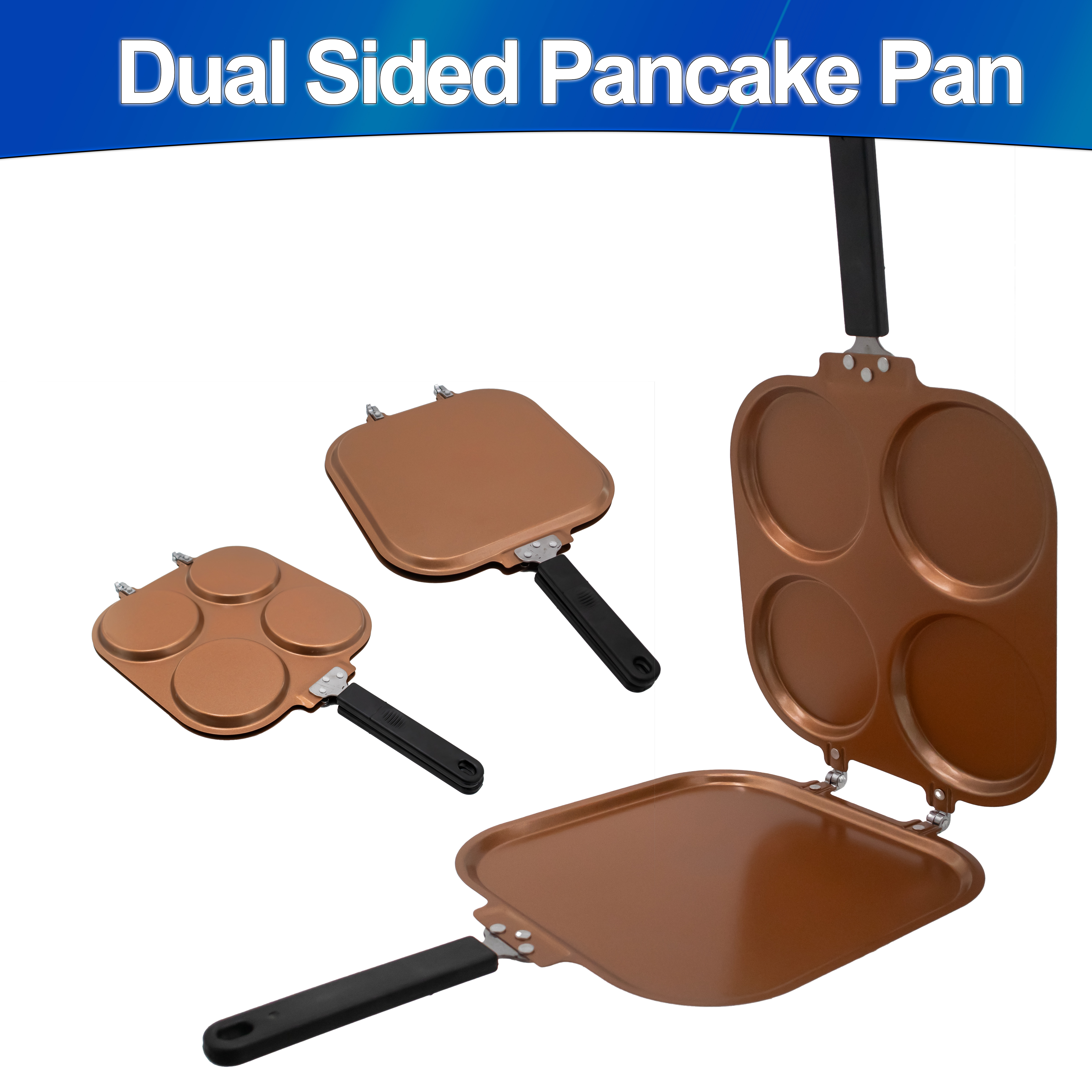 | 4 Mold Flip Pancake Pan - Dual-Sided Griddle, Copper Nonstick Aluminum Body and Reinforced Hinges, with 4 3/8" Mold Diameter and 6" Handle, Compact Fold Flat Storage for RVs, Small Kitchens & Apartments |