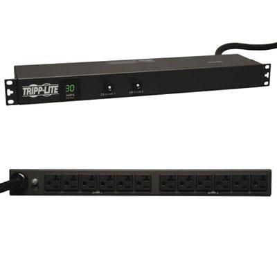 Tripp Lite's PDUMH30 AC power distribution unit offers a digital current monitor and provides 30 amps of 120 volt capacity in a versatile multi-mount cabinet (agency de-rated to 24A continuous). Detachable mounting flanges are configurable for wallmount, under-counter, or 1U/0U rackmount installation. Uses only 1U of rack space when installed in any 19-inch rack, with the potential for zero U mounting in the cable management area of most rack enclosures. Built-in digital ammeter display offers continuous visual input current monitoring data for the entire PDU. Attractive rackmount housing with 12 rear-facing outlets measures only 4.5 inches in depth. Output is arranged in two separately breakered 20A output loading banks. Unfiltered electrical pass-through without a power switch makes the PDUMH30 ideal for distributing UPS or generator power in rack enclosures, network closets, and more. Includes 12 rear-facing NEMA 5-15/20R outlets, 15-ft. AC power cord with L5-30P input plug. TVSS grounding lug and rugged all-metal rackmount case design. Key Features 120V / 30A Metered rackmount AC power distribution unit with 30 amp max capacity (Agency de-rated to 24A continuous) and 12 AC receptacles Front panel digital current monitoring display continuously shows input current level Versatile all-metal rackmount cabinet with detachable mounting flanges allows wall-mount, under-counter, and 19-inch rackmount mounting in both 1U and zero U formats Unfiltered electrical pass-through reliably distributes AC power from UPS or generator to supported equipment 12 NEMA 5-15/20R output receptacles accept common NEMA 5-15P and 5-20P equipment plugs Output is arranged in two separately breakered 20A output loading banks 15 foot AC power cord with NEMA L5-30P plug Switch-free design prevents the potential for accidental shutoff of connected loads 120 VAC, 50/60 Hz electrical compatibility Typical Applications Multi-outlet power distribution unit with digital current monitoring is the ideal means of powering multiple loads in 19 inch rackmount, wall-mount, and under-counter applications such as internetworking, PC systems, telecommunications, audio visual, security, sound reinforcement, and more. Ideal distribution of UPS and generator power or commercially derived AC power to connected equipment. Package Includes PDUMH30 Metered rackmount PDU Owner's manual with warranty information BRAND : TRIPP LITE